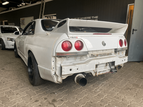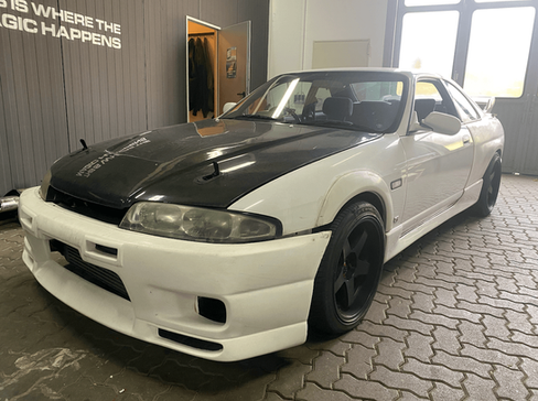 Diesen Nissan Skyline R33 haben wir vermutlich auch vom dem Tod durch Verwahrlosung bewahrt. Der Wagen stand lange Zeit als abgebrochenes Projekt mit fragwürdigen Um- und Anbauten in einer Garage rum, bevor er zu uns gekommen ist.